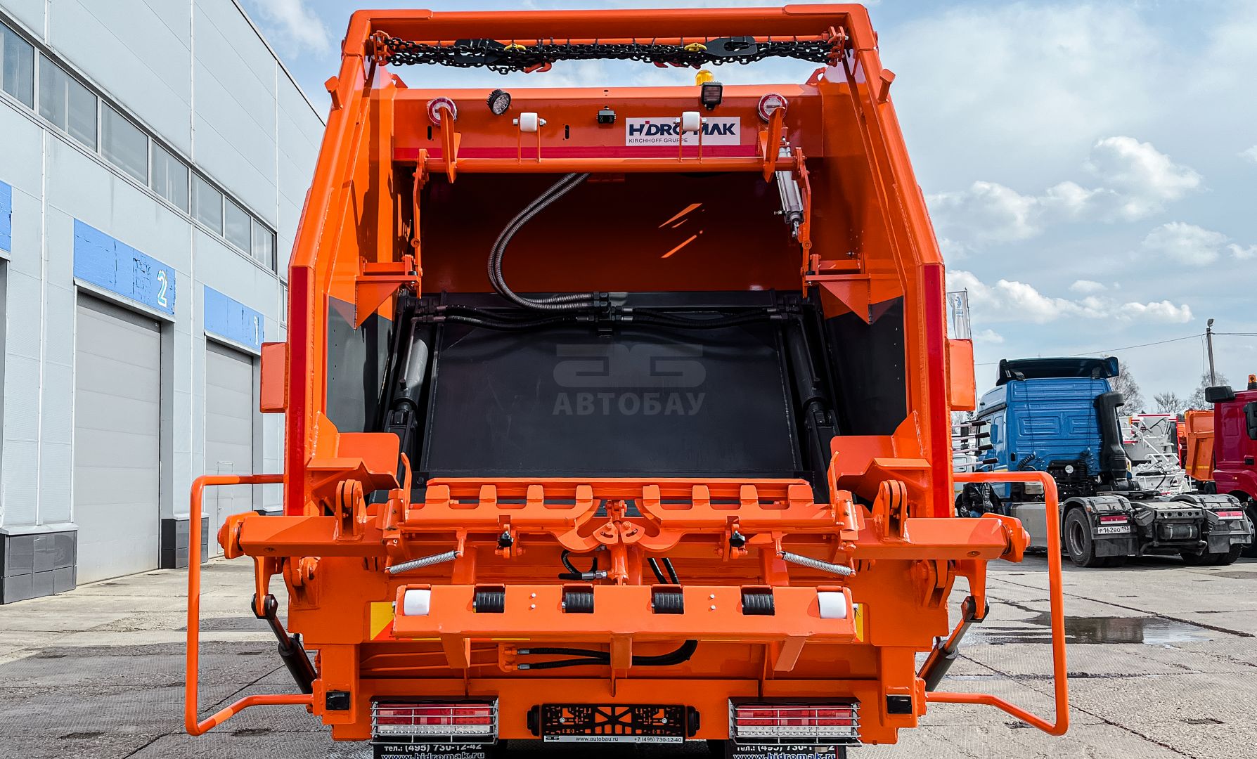 - Выталкивающая плита – специальной геометрической формы с уплотнителем, позволяет увеличить полезный объём кузова и обеспечивает более равномерные нагрузки на оборудование при прессовании и выгрузке мусора (совместная разработка HIDRO-MAK и FAUN KIRCHHOFF Gruppe)