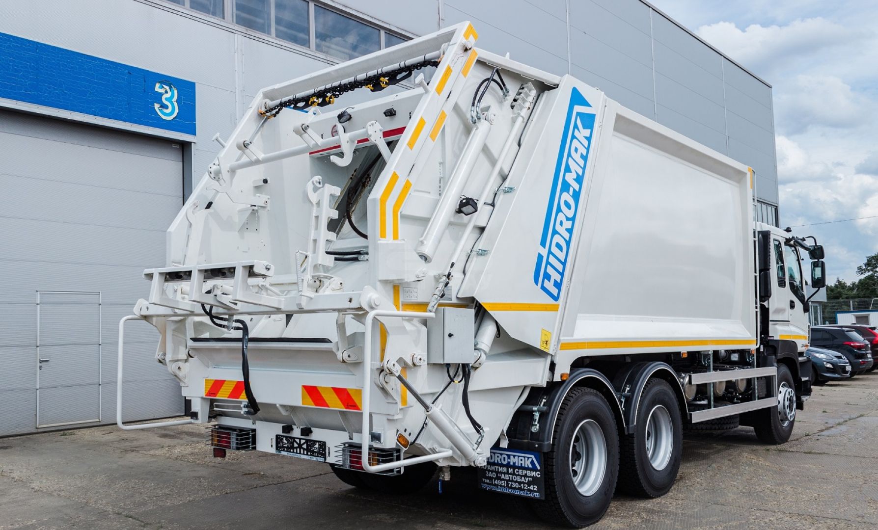 Мусоровоз имеет прессующую плиту, изготовленную из высокопрочной стали, выполняющую функцию забора и прессования отходов из загрузочного бункера в основной (приводится в действие четырьмя гидроцилиндрами), и выталкивающую плиту, которая выполняет функцию обратной нажимной пластины и позволяет производить процесс подпрессовки. В зависимости от плотности отходов, коэффициент уплотнения может увеличиваться до 1:6.