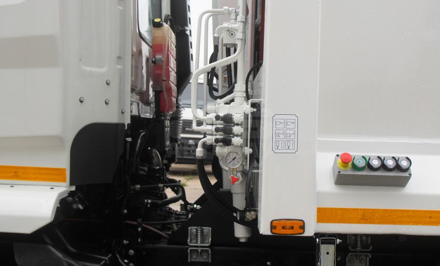 В мусоровозном оборудовании предусмотрена система отвода жидкости, образующейся в процессе прессования. Система состоит из заглубления в передней части надстройки с последующим отводом в бак для сбора жидкости и сливного крана из загрузочного бункера.